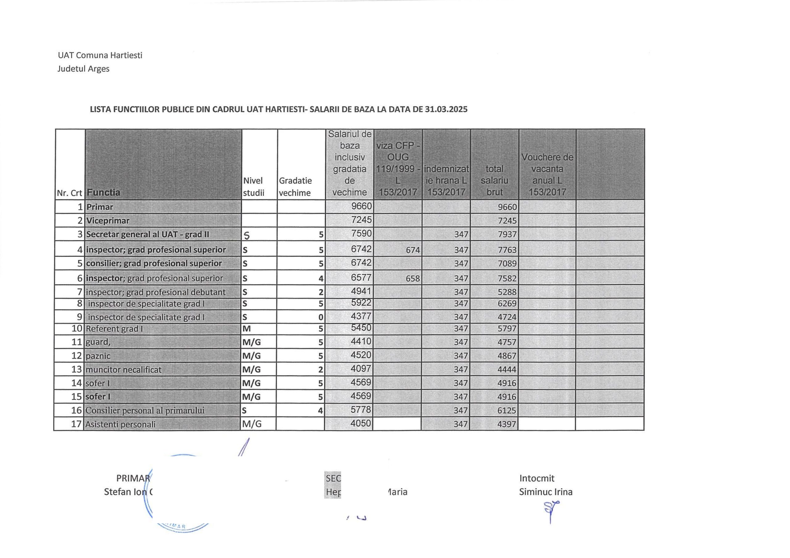 Lista functiilor publice din cadrul UAT Hartiesti – salarii de baza la data de 31.03.2025